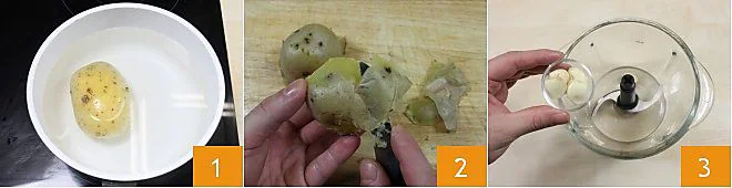 To prepare the garlic sauce, wash the potato well and boil it with the skin in salted water 1; when it is cooked (poke it with a fork to check for doneness), drain it and let it cool. Once cool, peel it 2 and cut it into wedges. Clean the garlic and place it in the mixer 3 (if you prefer, you can use a mortar)