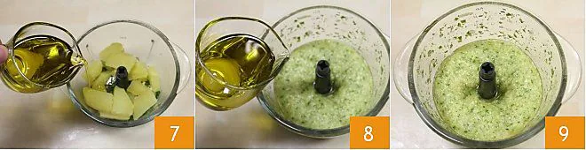 salt, pepper, and blend everything while gradually incorporating the oil (7-8). Once a thick cream is obtained, the garlic sauce is ready to be served with your dishes 9.