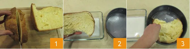 To prepare the gastronomic panettone cake, cut the savory panettone into slices about 1.2 inches thick 1, thus obtaining 6 slices. Butter a 20 cm (8-inch) springform pan, dip a first slice of panettone in milk 2 and place it on the bottom of the pan applying light pressure 3.