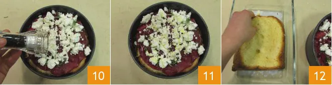 some rosemary needles and the oil 7, adjust with pepper and cover this layer with two more slices of soaked panettone, always ensuring they are evenly arranged. Then, creating the second layer, place the bresaola 8, add the chèvre (French goat cheese) 9,