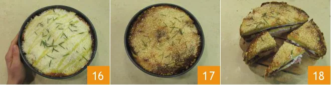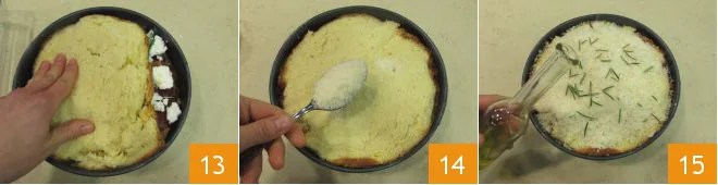 and place them inside the springform pan 13, sprinkle the surface with Parmesan cheese 14, rosemary, a drizzle of oil 15, and pepper.