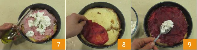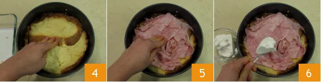 Dip and place a second slice, applying light pressure to completely cover the bottom 4. Distribute the slices of cooked ham 5, the ricotta cheese 6,