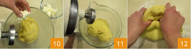 Continue to work the dough until you get a uniform and compact dough. Add the softened butter piece by piece 10 and work the mixture until all the butter is absorbed and the dough comes away from the sides of the mixer bowl 11. The dough should be firm and elastic, transfer it to a lightly floured work surface and briefly knead it 12 forming a ball;