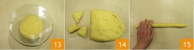 transfer it to a bowl, cover with plastic wrap 13 and let it rise at a temperature between 77°F and 81°F for 2 hours. After this time, the dough will have slightly risen. Pour again on the floured surface and divide the dough into 20 balls of 70 g each 14. For each ball, form a loaf about 12 inches long and with a diameter of about 1.2 inches 15. While working with one ball, keep the others covered with plastic wrap.