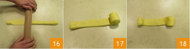 With the help of a rolling pin, slightly flatten the central part of the log, leaving the two ends of each log thick 16. Starting from one of the two ends, roll the strip up to the middle of the strip 17. Flip it 18 and roll from the other end of the dough.