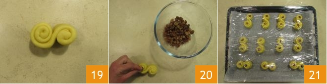 This way, you will have created the first "S" shaped sweet 19. Place the raisins in the center of each spiral 20. Gradually place the Saint Lucia Buns on a baking sheet lined with parchment paper 21 and let them rise again for about 30 minutes.