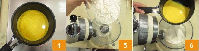 Transfer everything to the stove 4 and heat until it reaches around 95°F (to be measured with a kitchen thermometer). At this point, proceed with the dough: in the bowl of the stand mixer fitted with a hook, pour the flour 5, the saffron-flavored milk 6