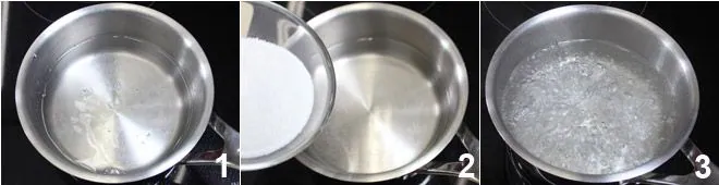 To prepare the strawberry popsicles, start by making a syrup: heat the water in a small saucepan 1 and add the sugar 2, let the sugar dissolve completely, turn off the heat and let it cool 3.