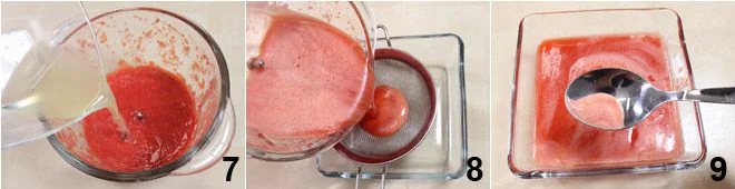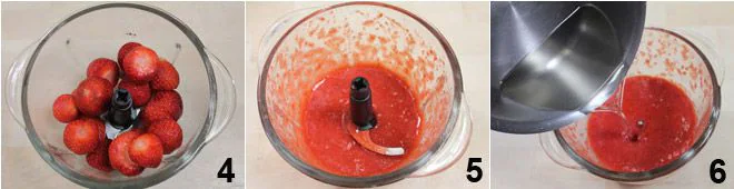 While the syrup cools, clean and wash the strawberries thoroughly under running water and blend them 4 until they reach a creamy consistency 5. Add the now-cold syrup to the strawberry puree 6