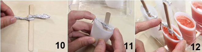 Now, take some common popsicle sticks and a sheet of aluminum foil. Form a small cord, wrap it around the stick 10, and secure the ends to the sides of the popsicle mold 11. This will help keep the stick centered when you pour the liquid mixture into the mold. At this point, pour the mixture into the mold, leaving 1/2 inch of space from the edge 12. Put your strawberry popsicles in the freezer until they have solidified!
