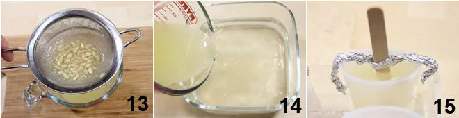 To prepare the lemon popsicles, start by preparing the syrup using the same procedure described above. While the syrup cools, squeeze the lemons until you obtain 5 oz of juice, filter it with a fine mesh strainer 13 and add it to the now-cold syrup 14. Repeat the stick procedure for the lemon popsicles, pour the liquid into the molds 15 remembering to leave 1/2 inch of space from the edge. Put them in the freezer until they have reached a solid consistency.