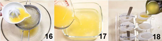 To prepare the orange popsicles, start by preparing the syrup using the same procedure described above. While the syrup cools, squeeze the oranges and filter the juice with a fine mesh strainer 16 and add it to the now-cold syrup 17. Repeat the stick procedure for the orange popsicles, pour the liquid into the molds 18 remembering to leave 1/2 inch of space from the edge. Put them in the freezer until they have reached a solid consistency.