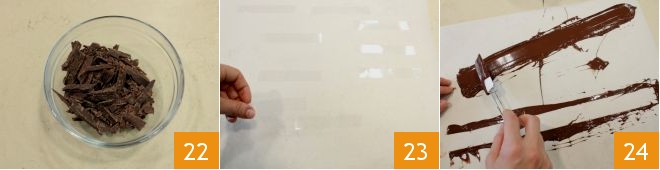 To make the chocolate bow, take the dark chocolate 22 and melt it in a bain-marie (or in the microwave), without exceeding 88°F. Then cut rectangular strips of acetate sheets (available at stationery stores): 2 of 1.5 inches thick and 11.8 inches long that can cross the cake, covering both the surface and the edges: these will be the ribbons that close the gift box cake. Then cut multiple small rectangles of acetate 4x0.6 inches to create the bow loops and arrange them on a sheet of parchment paper 23. Set aside a little melted chocolate in a piping bag, spread the rest over the acetate strips, spreading it carefully with a spatula 34.