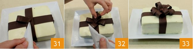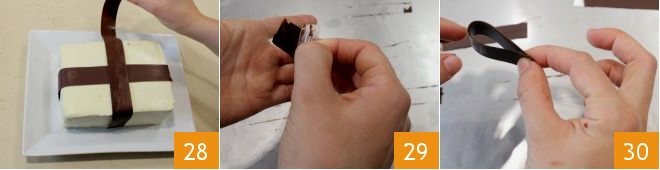 Cross the other chocolate strip 28 and gently peel off the acetate. Now proceed to make the ribbon bow: remove the acetate from the chocolate strips (if you see it starting to melt, follow the instructions by placing it back in the freezer for a few moments) 29 and attach the two ends 30;