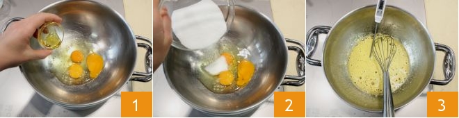 To prepare the gift box cake, start with the sponge cake using the hot method: pour the whole eggs, with wildflower or acacia honey 1 and sugar 2 into a mixing bowl (or a bowl over a bain-marie): it is important that the water in the pot does not reach the bottom of the mixing bowl. Beat the mixture with a whisk and heat it to 104°F (you can measure the temperature with a food thermometer).