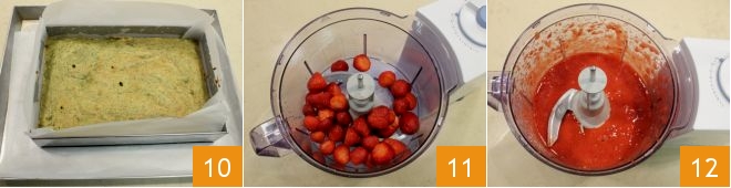 Once baked, remove it from the oven 10, let it cool slightly, then remove the sponge cake from the pan and let it cool completely on a wire rack. Meanwhile, prepare the filling: wash the strawberries, remove the green leaves, and place them in a blender 11. Blend to obtain a smooth puree 12 that you can pass through a sieve to remove any lumps.