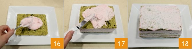 Place a rectangle of sponge cake on a serving plate, spread a layer of cream evenly 16, and continue alternating a layer of sponge cake and a layer of cream, ending with the latter (17-18). Place the cake in the refrigerator for at least two hours to set, while you continue with the preparation.