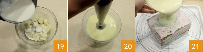 Focus on the coating. Heat the cream and pour it over the white chocolate 19, stir to melt it completely, and if necessary, blend it with an immersion blender to avoid lumps 20. Let it cool, then once cool, pour it over the cake placed on a wire rack starting from the center 21, to completely cover the whole cake.