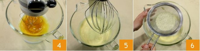 Transfer the mixture to a stand mixer and whisk it (you can also use an electric beater) at medium speed for about ten minutes (4-5); then sift the all-purpose flour and pistachio flour 6,
