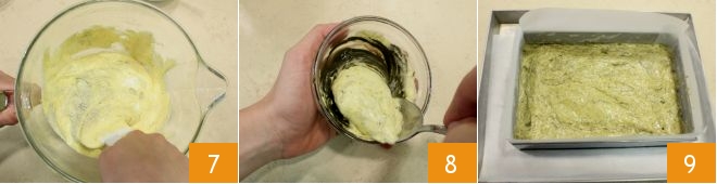 fold them into the mixture with a spatula 7; slightly heat the pistachio paste (this will ensure it is at the same temperature as the batter) and dilute it with a spoonful of the mixture 8. Add it to the batter, mix, then pour everything into a 10x7 inch rectangular pan lined with parchment paper 9. Bake in a preheated static oven at 356°F for about 20-25 minutes (320°F for about 10-15 minutes if using a fan oven).
