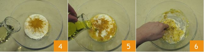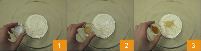 To make ginger and turmeric taralli, start by preparing the dough: put the flour in a bowl and add the salt 1, ginger 2, and turmeric 3;