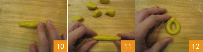 roll the pieces of dough with your fingers 10 until you get sticks about 0.4 inches thick and about 3 inches long 11. Join and overlap the ends of each stick to form a drop shape 12