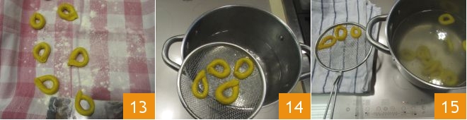 and place the formed taralli on a lightly floured cloth 13. Now bring a pot of water to a boil and cook a few taralli at a time 14; when they float to the surface, drain them with a slotted spoon and place them gently on an absorbent cloth 15.