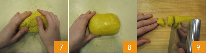 Transfer the mixture to a work surface and knead quickly 7 until you get a smooth and uniform dough, then wrap it in plastic wrap 8 and let it rest at room temperature for 30 minutes. After the resting time, take the dough and divide it into rather small pieces 9;