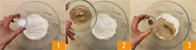 To prepare the gingerbread house cake, start with the cookie dough: in a bowl, place the all-purpose flour together with the baking soda 1 and brown sugar 2, then add a pinch of salt, nutmeg, and cinnamon 3.