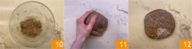 Knead with your hands first in the bowl 10 and then on the work surface 11. Form a dough ball, wrap it in plastic wrap, and let it rest in the refrigerator for 3 hours 12.