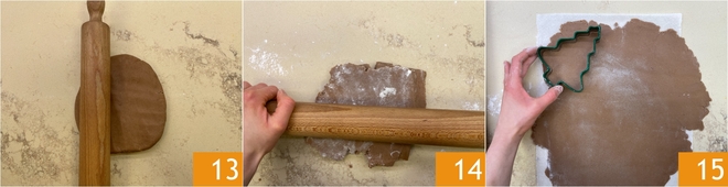After the resting time, gently tap the dough with a rolling pin to make it pliable again 13, then lightly flour it and roll it out to a thickness of about 1/8 inch 14. Cut out 3 Christmas tree-shaped cookies using cookie cutters of various sizes 15.