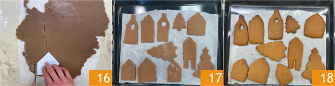 Also cut out 8-9 houses using different templates 16. Place the cookie shapes on a baking sheet lined with parchment paper and bake in a preheated static oven at 350°F for about 10 minutes, on the center rack 17. Once baked, remove from the oven and let cool 18.