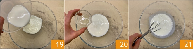 To prepare the cake batter, start with the buttermilk: in a bowl, pour the yogurt, milk 19, and lemon juice 20, then mix with a whisk 21 and let it rest at room temperature for about 30 minutes.