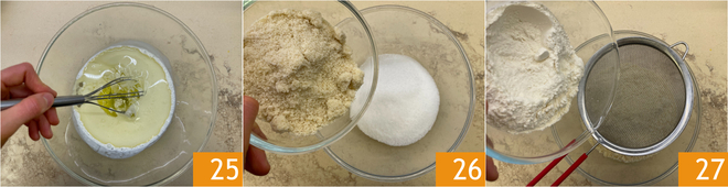 Mix with a whisk to combine the liquids 22 and set aside for a moment. In another bowl, combine the sugar and almond flour 26, then sift in the all-purpose flour 27.
