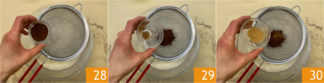 Sift the cocoa 28, cinnamon 29, and ginger 30 into the bowl as well.