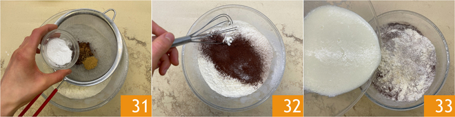 Finally, add the baking soda 31 and a pinch of salt. Mix with a whisk to combine the dry ingredients 32. At this point, pour the liquid ingredients into the bowl with the dry ingredients 33.