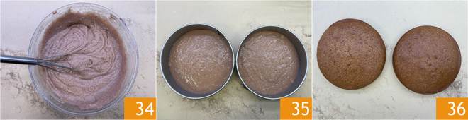 Mix well with the whisk until you obtain a smooth and homogeneous batter 34. Divide the batter evenly between two 8-inch springform pans, which you have previously greased with butter and lined with parchment paper at the base 35. Bake in a preheated static oven at 350°F for about 33-35 minutes, on the first lower rack. Check the baking with a toothpick, then remove from the oven and let cool completely before removing the cakes from the pans 36.