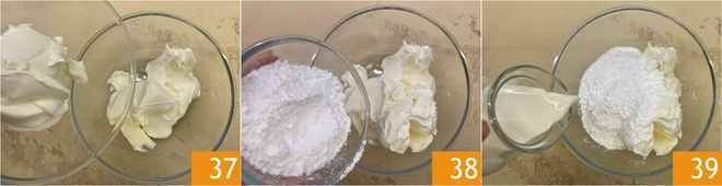 To assemble the cake, first prepare the frosting: in a bowl, combine the mascarpone, cream cheese 37, powdered sugar 38, and cream 39.