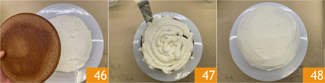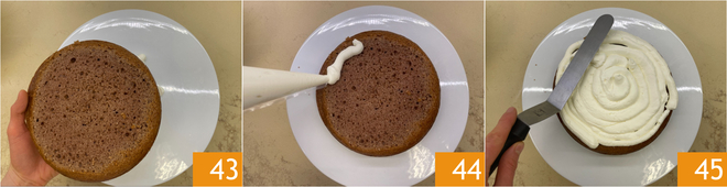 Place the first base on the plate 43 and fill it with a generous layer of frosting 44, then level with a spatula 45.