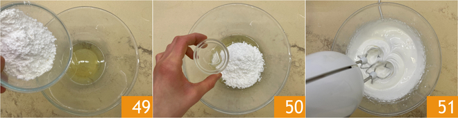 To decorate the cookies, first prepare the royal icing: in a bowl, pour the egg white, powdered sugar 49, and lemon juice 50, then beat with electric beaters for about 5 minutes until you obtain a firm and homogeneous mixture 51.
