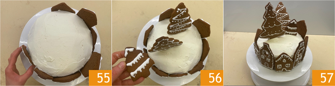 Take the cake out of the refrigerator and place the house-shaped cookies along the edges 55, then arrange the tree-shaped cookies vertically on the surface 56. Your gingerbread house cake is ready to be served 57!