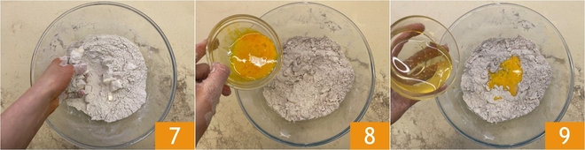 Incorporate the butter quickly with your fingertips to obtain a sandy mixture 7, then pour in the beaten egg 8 and honey 9.