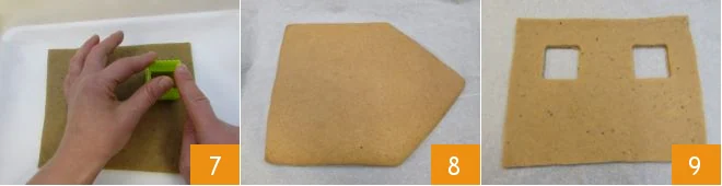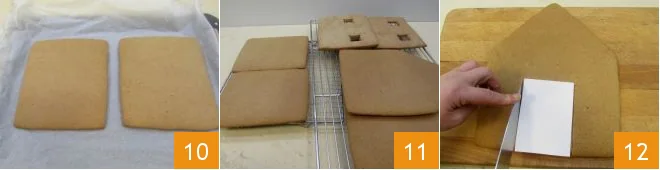 and roof 10. Place them on a wire rack to cool completely 11. Then cut out the door with a knife using the 4.3x3.15 inch rectangular template 12.