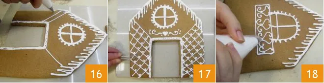 and gently remove it 13. At this point, start decorating the front with the royal icing as you prefer, retracing the roof's edge and simulating melting snow 14; also create a central window 15.