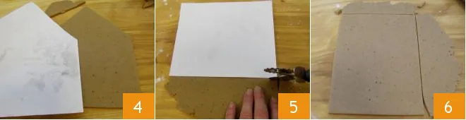 Proceed the same way for the back 4. Then move on to the side walls, with the larger rectangular template (5-6): make two of these. Finally, from the last two doughs, cut out the roof using the 7.5x5.75 inch templates 6.