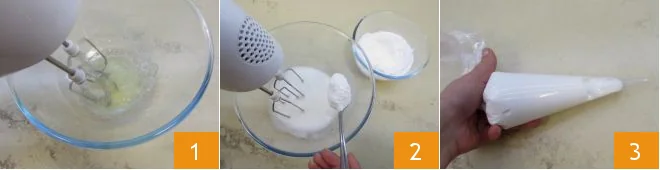 Prepare the royal icing you'll need for decorating the house and other elements. Pour the egg whites into a bowl with a few drops of lemon juice: this will help them whip better. Turn on the beaters 1 and when the egg whites are well whipped, gradually add the previously sifted powdered sugar into the bowl 2. Continue working the icing with the beaters until the powdered sugar is fully incorporated and you have a smooth, lump-free icing. Transfer the royal icing into two piping bags: a larger one with a plain tip for holding the parts of the house together and a smaller one for small decorations 3. Cut the tips to create a small hole only when you are ready to use the icing.
