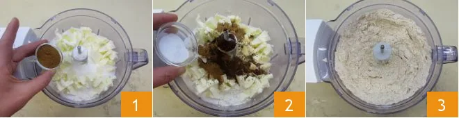 To prepare the gingerbread house, start with the dough: in the bowl of a mixer, add the sifted flour, granulated sugar, cold butter cut into pieces, and all the ground spices: cinnamon 1, ginger, nutmeg, cloves. Then add the baking soda and salt 2. Turn on the blades and create a sandy mixture 3,