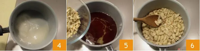 Place a sheet of wax paper (or parchment paper) on a baking sheet: this will be used later to cool the almond brittle (if you have it, you can use a silicone mat). In a saucepan, add the sugar, lemon juice, and water 4. Melt slowly over low heat, stirring constantly, until you get a nice golden-colored mixture. Meanwhile, roughly chop some of the almonds, leaving the remaining ones whole. Once the caramel is ready, turn off the heat and add the chopped almonds and whole ones to the saucepan 5. Stir the almonds vigorously with a wooden spoon 6 and mix everything together.