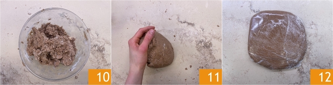When you have obtained a rough mixture 10, transfer it to the work surface and compact it with your hands 11, then flatten it slightly and wrap it in cling film. Let it rest in the refrigerator for at least 3 hours 12.