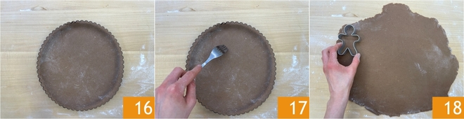Adhere the dough well to the edges and trim the excess 16. Prick the base with a fork to prevent it from swelling during baking 17 and bake it in a preheated static oven at 350°F for about 30 minutes, on the lower rack. Once cooked, take it out and let it cool. In the meantime, roll out the leftover dough again to a thickness of 1/6 - 1/5 inch and cut out gingerbread men using the appropriate cookie cutter 18.